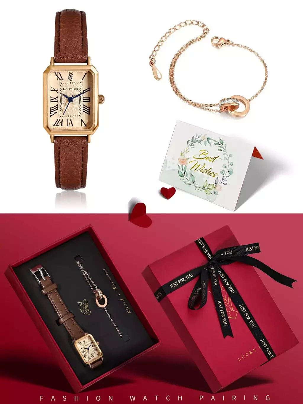 Apresentamos o deslumbrante conjunto de caixa de presente Lucky Fox, que combina um relógio elegante com uma pulseira simples e refinada. Com design moderno e acabamento impecável, esse conjunto é perfeito para quem busca um acessório que alia luxo e estilo em uma única peça.