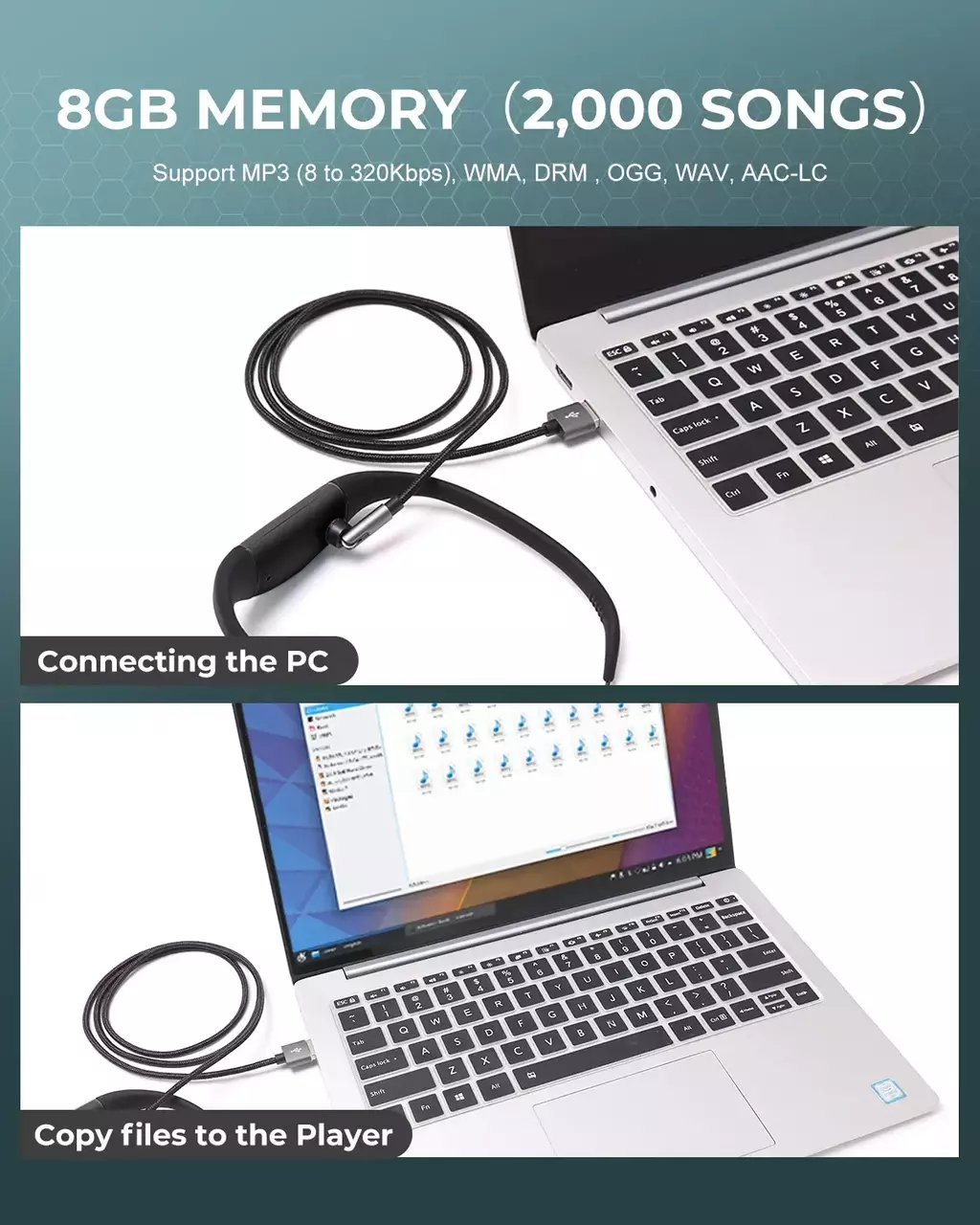 O Tayogo MP3 à prova d'água vem com uma generosa memória interna de 8GB, permitindo que você armazene centenas de músicas para acompanhar seus treinos. Além disso, sua bateria de longa duração garante horas de reprodução contínua, sem interrupções. Com suporte a diferentes formatos de áudio, você poderá desfrutar de toda a sua biblioteca musical mesmo debaixo d'água.